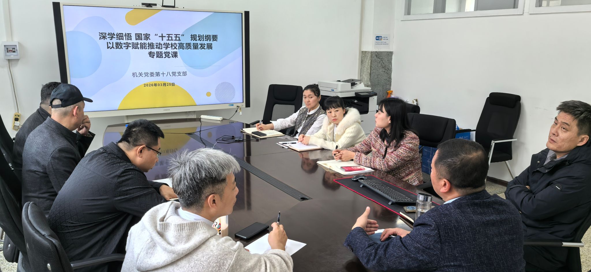 2026年3月25日,机关党委第十八党支部组织开展了“深学细悟国家‘十五五’规划纲要,以数字赋能推动学校高质量发展”专题党课,全体党员参加。
